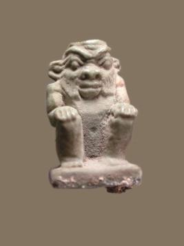 | Description / विवरण | The dwarf like god Bestet is represented nude, crouched, hands resting on his knees, his face surrounded by a lion s mane. His tail, legs and arms are depicted in the round. The head dress is lost as part of the suspension loop. |