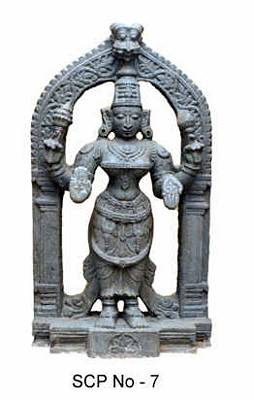 | Description / विवरण | Lakshmi as Sridevi -- standing in samabhanga aspect. There is a makara torana all around with kirti mukha motif in the centre on the top. She is adorned with karanda makuta. She has long pointed nose. The ear lobes are long and decorated with chakra kundalas. It is four armed. The two rear hands carry lotus buds, while the right front hand is in abhaya mudra and the front left hand in varada mudra. The face is oval in shape. There are two tight necklaces kantha malas on the chest around the neck. There is also a kucha bandha. The waist is sharp and curved. The drapery consists of purnoruka full garment tied by a mekhala girdle with tassels and folds. The dhoti falls up to the ankle level. On the hind side the ends of the dhoti fall up to the floor level on either side. Other ornaments include Keyuras, wristlets, anklets and manjiras. The image stands on a lotus pedestal. It seems to belong to vijayanagara period School of Art. The prabhavali around is profusely carved with foliage patterns. |