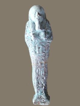 | Description / विवरण | The figure is a miniature mummy-form coffin. It wears a wig and has a plain beard. Both hands folded, stands with both legs joined over a rectangular small base. The left hand holds a pick and the right hand holds a hoe. |