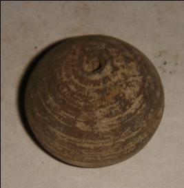 | Description / विवरण | Small terracotta bead with betel nut body and flat base. It has perforated hole in centre and surrounded with striation marks. It is semi fine and has a depression at base. The body is slightly rubbed off. |