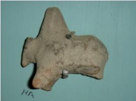 | Description / विवरण | Small indigenous figurine of humped bull having pinched mouth, eyes, ears, an elongated hump, simplified limbs and buttock are there. The hind limbs are chopped off. |