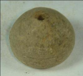| Description / विवरण | Well made, perforated terracotta bead, betel nut in shape with flat circular base. Close concentric circles are prominent on the lower part of the bead. |