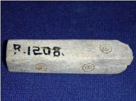 | Description / विवरण | Bone dice rectangular in shape, having engraved circular designs on three sides. |