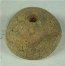 | Description / विवरण | Ill fired, perforated terracotta bead, betel nut in shape. Clay incrustation is visible on the body. |