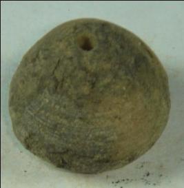| Description / विवरण | Ill fired, perforated terracotta bead with pot-shaped body and a circular depression at the base. The surface is almost peeled off. |