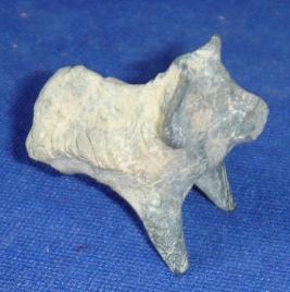 | Description / विवरण | Tiny terracotta animal figurine of dog, having prominent facial features, broken nose and missing right hand limb. Incised lines on body. |