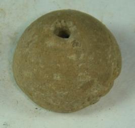 | Description / विवरण | Perforated terracotta bead, betel nut in shape. The bottom of the base has five grooves forming a flower. |
