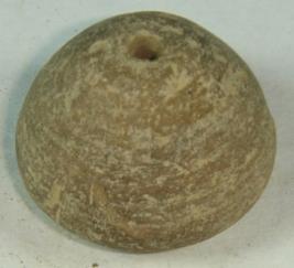 | Description / विवरण | Simple, perforated terracotta bead, betel nut in shape. There are small pits at the base. |
