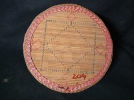 | Description / विवरण | A circular mat with spokes fitted inside evenly, used as a glass cover. It is made up of grass. It has geometrical pattern design stitched in thread. It has two borders. |