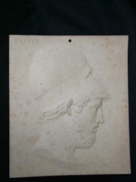 | Description / विवरण | A portrait of a male model in profile named Ulysse . It is a relief work on rectangular sized cardboard thin . The model is bearded having curved hair. He is wearing a huge cap on his head. |