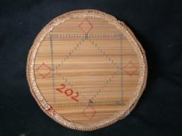 | Description / विवरण | A circular mat made up of some grass used as a glass cover. It has designs in geometrical pattern. It has two borders. |