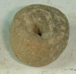 | Description / विवरण | Small, perforated terracotta bead, irregular in shape. |