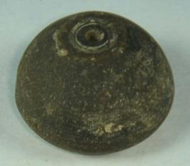 | Description / विवरण | Simple, perforated terracotta bead, betel nut in shape. The tip is flat, the base has many cut marks. |