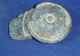| Description / विवरण | Fragment of a stone lid, only the knob and small part of body is visible. The knob is short and top of it is in oval shape, the rim of lid is partially broken. The knob has circular incised line designs around the rim. |