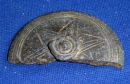 | Description / विवरण | Fragment of a stone lid, semi circular in shape with a knob at the centre having some incised line designs on the surface and spiral marks are also seen. |