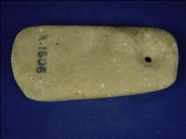 | Description / विवरण | Grinder, flat and rectangular in shape with smooth surfaces. Hole is seen in shape with smooth surfaces. Hole is seen on the one end. It is slightly flaked off. |