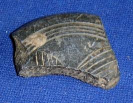 | Description / विवरण | Fragment of a stone plate, a part of rim is visible, which is vertical, the inner surface is plain and outer surface has some incised line designs. |
