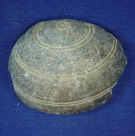 | Description / विवरण | Fragment of dome shaped stone lid with thick body portion and thin rim. The exterior surface has a circular, incised on the tip and three incised circular designs around the body. |