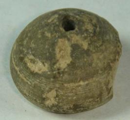 | Description / विवरण | Terracotta perforated bead, betel nut in shape, the surface is rough, clay incrustation all over. |