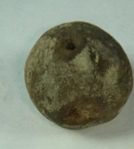 | Description / विवरण | Perforated terracotta bead, betel nut shape, surface is rough, clay incrustation all over. |