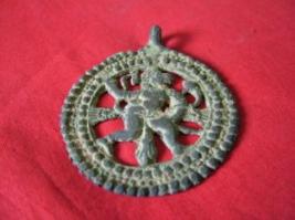 | Description / विवरण | A round pendant decorated with dot patterns in two rows is also decorated with the sculpture of Lord Hanuman. |