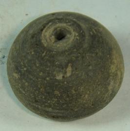 | Description / विवरण | Perforated terracotta bead, having pot like shape with deep depression at the base and upper portion having striation marks |