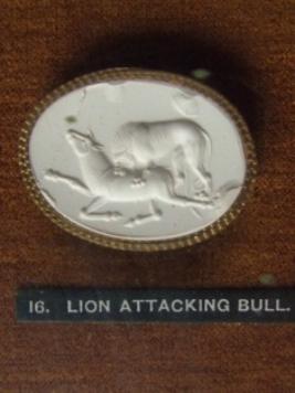 | Description / विवरण | An early scaraboid. It shows a lion attacking a bull, relief in POP. Fine textures, clear body postures and muscles, etc. Bull crying in pain and lion biting its back. Oval shape. Cast in POP from British Museum. Framed in golden coloured plate. |
