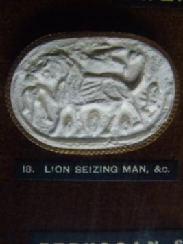 | Description / विवरण | A Phoenician gem. Relief work in POP. It shows a lion seizing a man, where lion is very big than the figure of man. Hard cuts and textures. Small symbols around. Oval shape. Framed in golden coloured plate. A small cast from British Museum. |