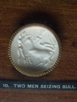 | Description / विवरण | Two men seeing bull, bull in the center, thin symbolic figures of men. Fine relief work. Round shape. Framed in golden coloured plate. Archaic gem from Greek islands. Small casts from British Museum, in POP. |
