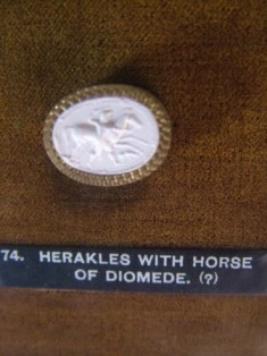 | Description / विवरण | An Etruscan scarab. It shows Herakles with Horse of Diomede. Thin border. Oval shape frame. Fine relief work in POP, small cast from British Museum. |