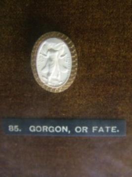 | Description / विवरण | An Etruscan scarab. It shows Gorgon, or Fate. Standing position, necklaces in both hands. Wings are seen. Oval shape. Framed. Fine relief work in POP, small cast from British Museum. |