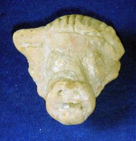 | Description / विवरण | Broken terracotta head of animal figure, with projecting eye and protruding mouth with two hole as nose. There is incised lines between horns. |