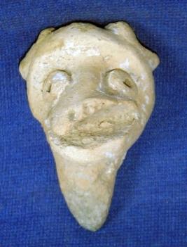 | Description / विवरण | Terracotta monkey head, ill fired, having prominent facial features, with projected eyes and broken open mouth. There is pointed projection at base, probably to fix the head with rest of body. |