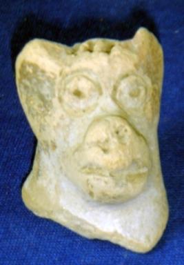 | Description / विवरण | Terracotta monkey head, with prominent facial features, projected eyes, bulking mouth. There are incised lines between its ears. Base is slightly broken. |