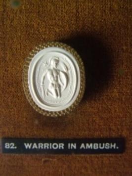 | Description / विवरण | An Etruscan scarab. It shows warrior in Ambush, holding a shield and a sword. Both legs pulled upwards. A thin high relief border. Oval shape. Framed. Fine relief work in POP, small cast from British Museum. |
