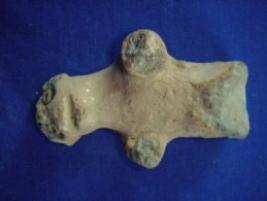 | Description / विवरण | terracotta human figure. The face has round incised eyes, rubbed off nose and protruding mouth. The hands are broken. The legs and tail are missing. |
