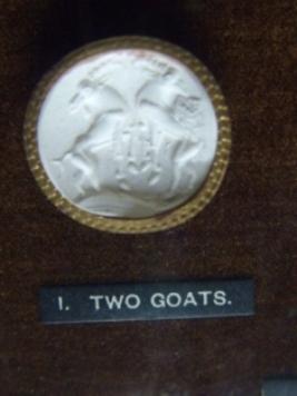 | Description / विवरण | Small archaic gems from the Greek Islands. A cast in POP. Fine relief work where two goats are seen, with their heads turned in opposite directions. Fine body postures. Round in shape. Framed in golden coloured. |