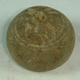 | Description / विवरण | Perforated terracotta bead having pot like shape, nail impression around the top. |