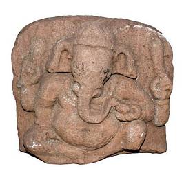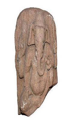 | Description / विवरण | Seated Ganesa with karandamakuta and broad expanded ears. The two rear hands hold trident and goad. The lower right hand rests on the lap, while the lower left hand holds the modaka. The trunk is turned leftwards and raised up so as to touch the modaka in the left hand. Meager Ornamentation. |