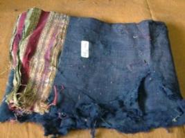 | Description / विवरण | It is a cotton piece of cloth, plain blue, having on both side red, golden stripes border. Now it is badly damaged. |