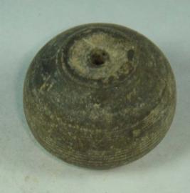| Description / विवरण | Simple, perforated terracotta bead, betel nut in shape. Both the holes have depression and the body has mild striation marks at the middle and the base. |