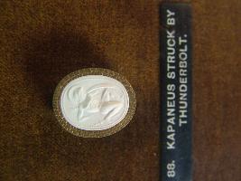 | Description / विवरण | An Etruscan scarab. It shows Kapaneus struck by Thunderbolt. Nude figure, showing the muscular effect, sitting on one knee one foot. Thin border. Oval shape. Framed. Fine relief work in POP, small cast from British Museum. |