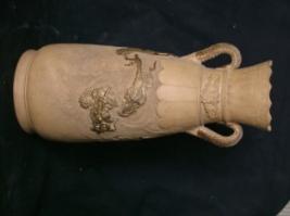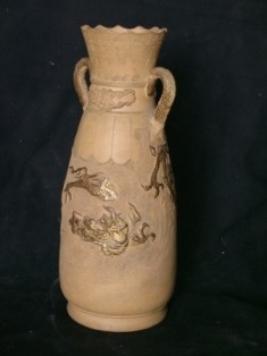 | Description / विवरण | Long vase having two curved handles and almost cylindrical body and wavy rim. The neck portion is ornamented with relief work. On the belly dragons in gold colour are depicted in high relief ornamentation. |