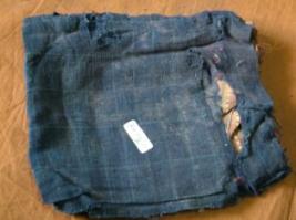 | Description / विवरण | It is a cotton cloth piece in which dark blue is dominant colour. It is having light brown and green coloured strip in two ends. Its yarns are coming out to some extent. |