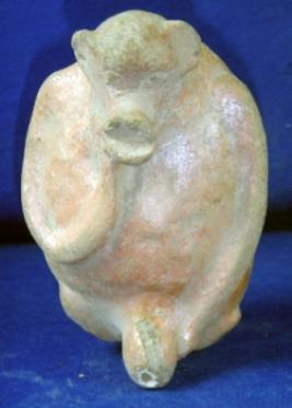 | Description / विवरण | Terracotta animal figurine of chimpanzee, it has bulging body probably it might be used for storage purpose, it is seated with glazed body, genital is made by spouted hole, facial features are visible with prominent ears, incised eyes, projected mouth, one hand is depicted on its chin and another hand is shown, holding the genital spout. |