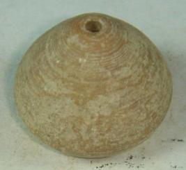 | Description / विवरण | Perforated terracotta bead, betel nut shape, with a deep circular depression at the centre, striation marks are seen on the body. |