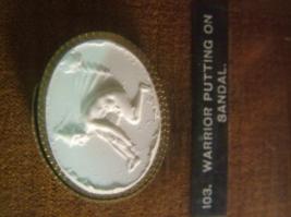 | Description / विवरण | An Etruscan scarab. It shows warrior putting on sandal. Nude figure but wearing a helmet. Oval shape. Framed. Fine relief work in POP, small cast from British Museum. |