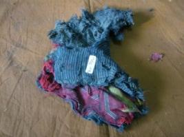 | Description / विवरण | A piece of cloth, white strips in blue ground. But now its totally damaged. |