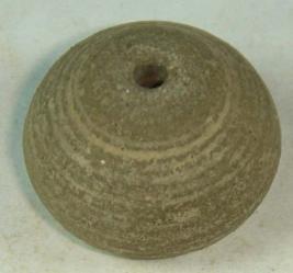| Description / विवरण | Ill fired, terracotta perforated, betel nut bead, with a slight depression on the centre of the base. Close striation marks are clearly visible on the body. |