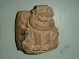 | Description / विवरण | Terracotta lion figurine whose mouth and front legs are visible. It is in seated pose but back side body is missing. |